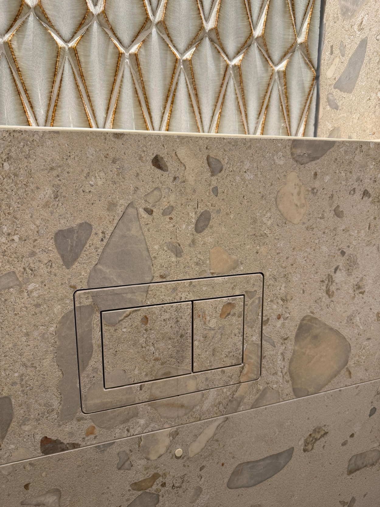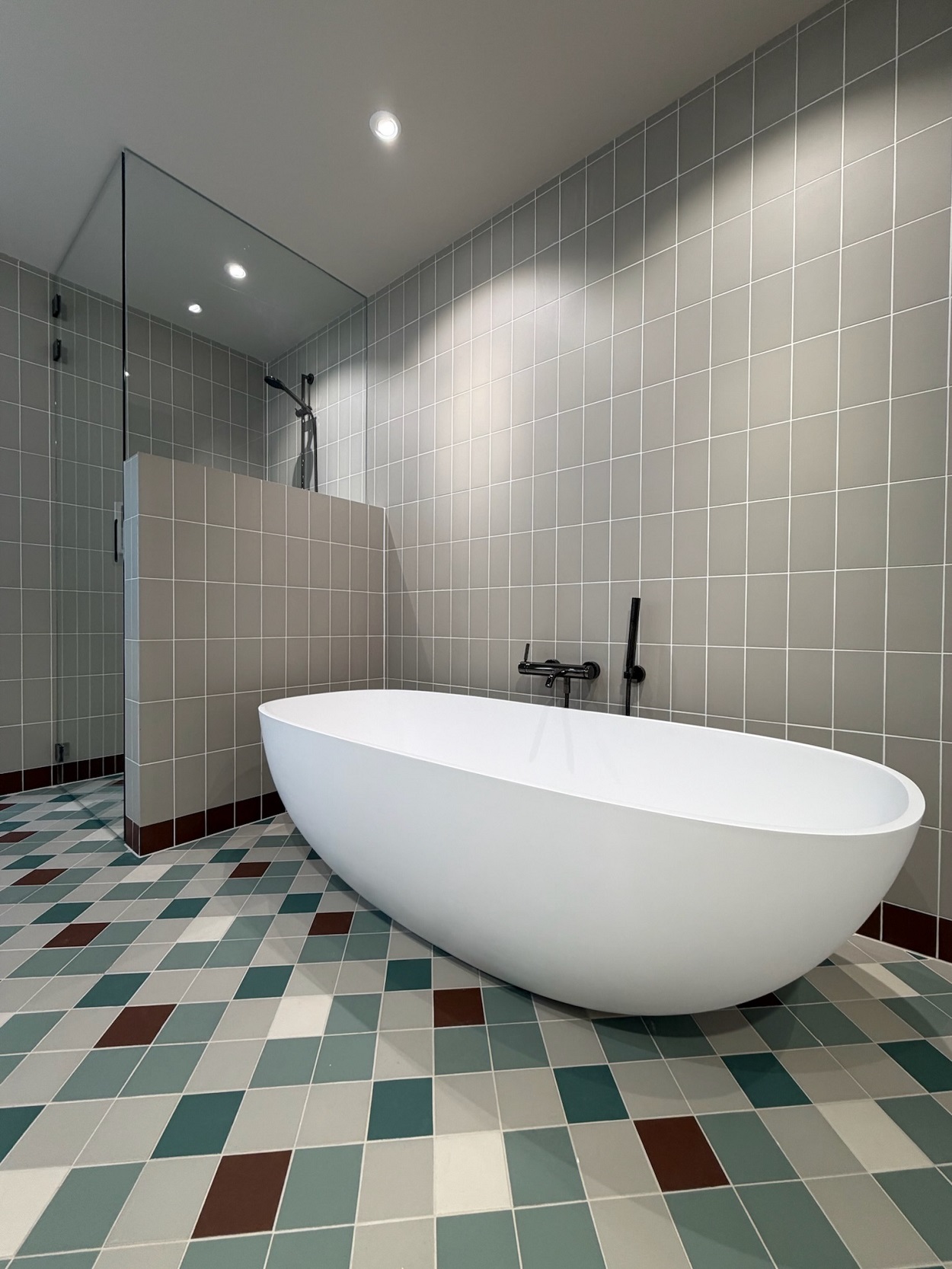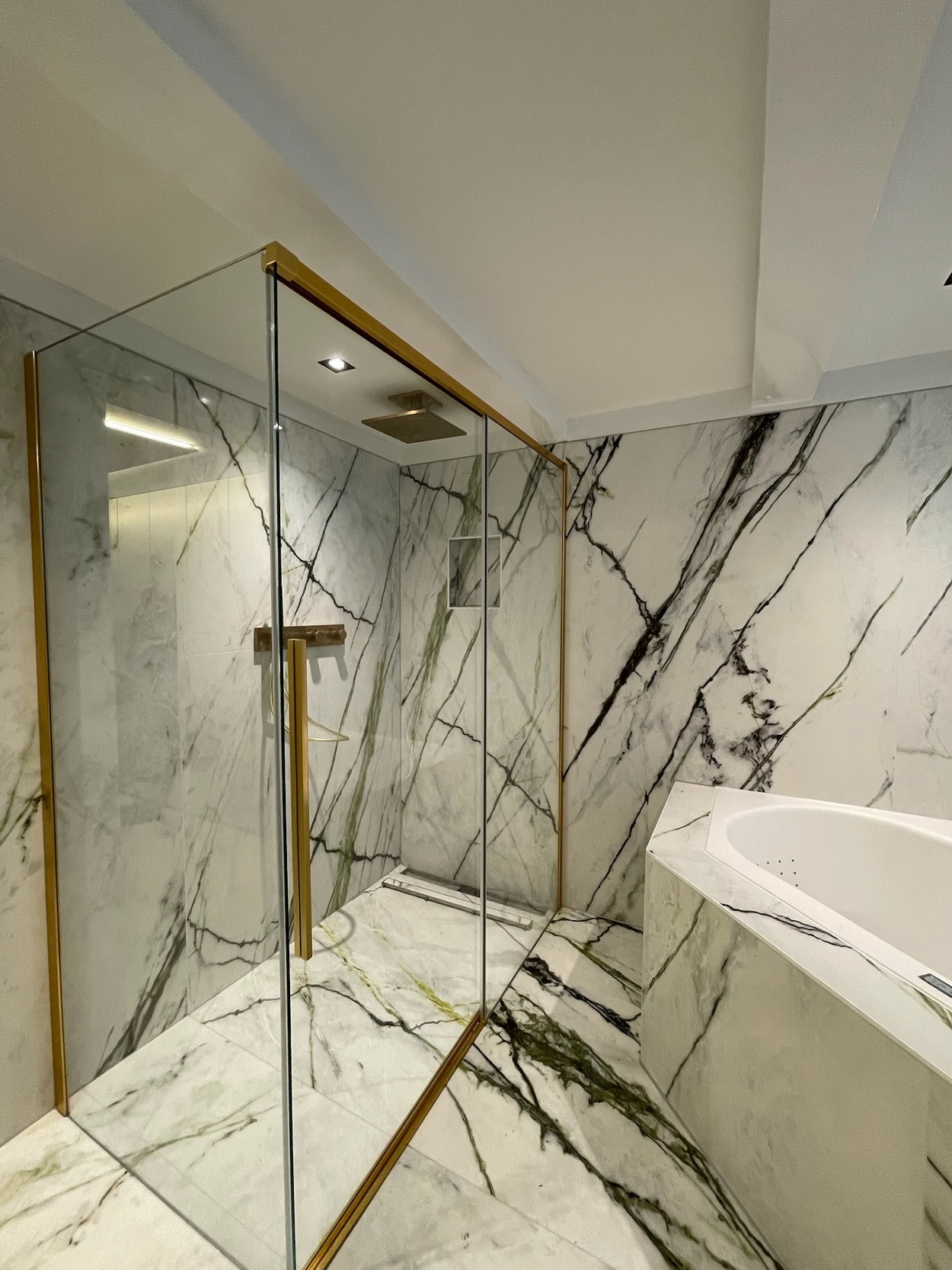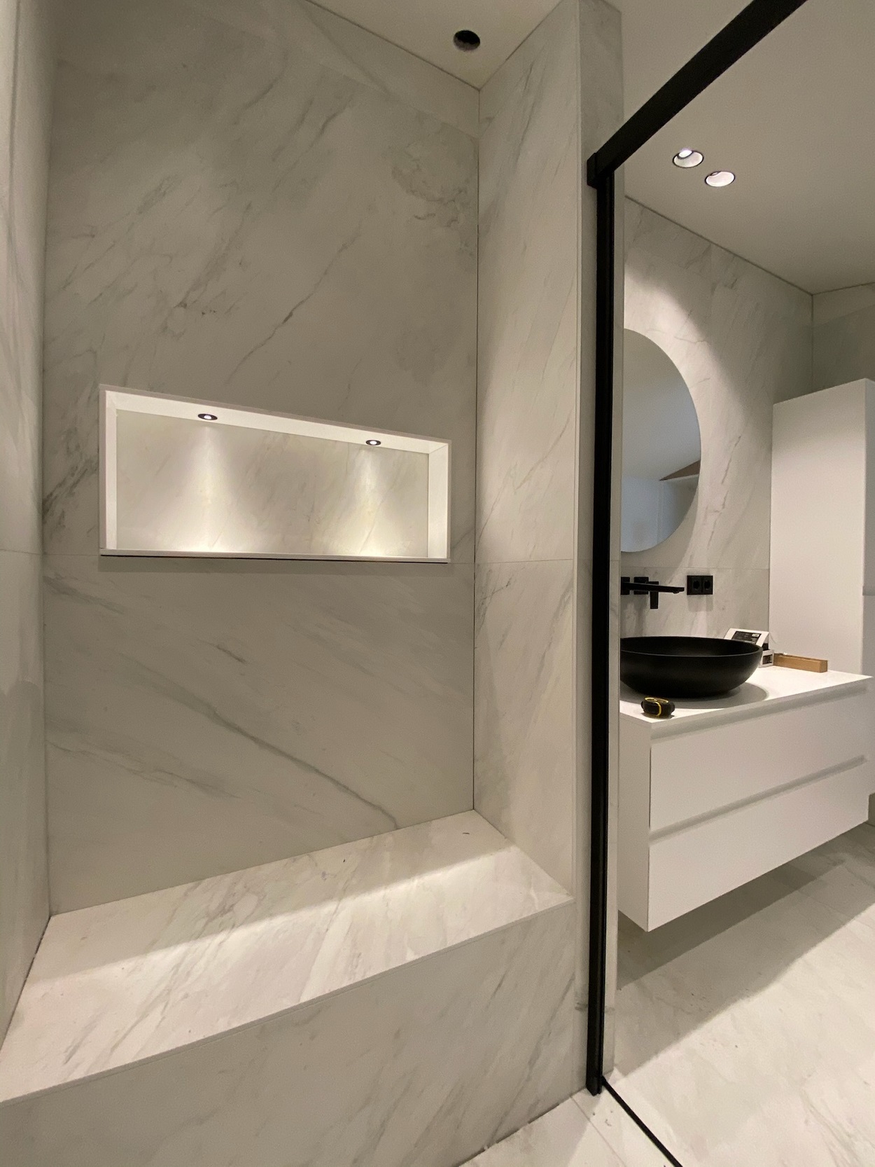 Wanneer we daarmee klaar zijn, gaan we aan de slag met het tegelwerk. Wij zijn gespecialiseerd in het aanbrengen van groot formaat tegels. Deze slijpen wij in verstek. Tegels in verstek slijpen betekent dat de rand van 0 tot 45 graden wordt geslepen. Door het slijpen en polijsten van de badkamertegels halen we scherpe randen weg. Bovendien geeft dit een bijzonder strak resultaat.